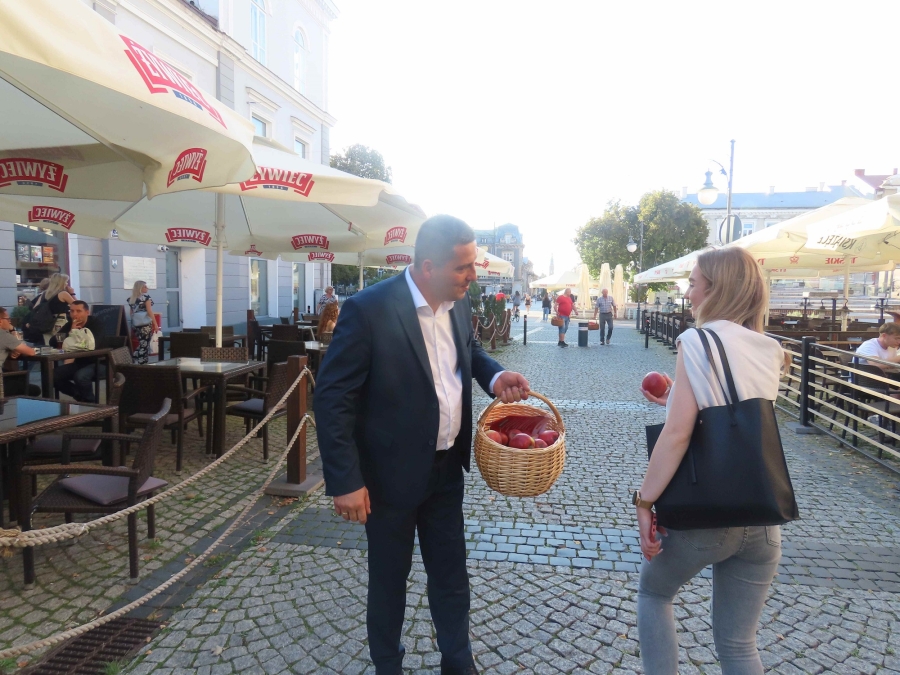 Z  tej  okazji dzisiaj  przeprowadziliśmy uliczną  akcję , mającą  na  celu  popularyzowanie  jabłek, jako najzdrowszego  owocu  świata, którego 45%  produkcji    w Polsce  pochodzi z  naszego  regionu .