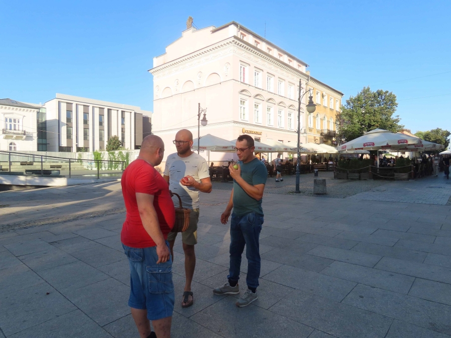 Rozdawaliśmy  jabłka  na  deptaku  przy  ulicy  Żeromskiego  w  Radomiu.  Przechodnie  chętnie  się  nimi  częstowali. Chwalili  ich  smak i  wygląd.